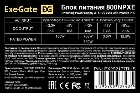 Блок питания 800W ExeGate 800NPXE (ATX, PPFC, 12cm fan, 24pin, 2x(4+4)pin, 2xPCI-E, 5xSATA, 3xIDE, black)