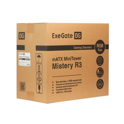 Корпус Minitower ExeGate Mistery R3-NPX450 (mATX, БП 450NPX с вент. 12 см, 2*USB+1*USB3.0, аудио, черный, 4 вент. 12см с RGB подсветкой, боковая панель - закаленное стекло)