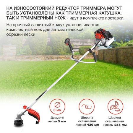 В комплекте поставляется катушка с леской для обработки мелкой и средней травы, а также триммерный нож для скашивания более густой и жесткой растительности. Благодаря ширине скашивания леской в 430 мм и ширине скашивания ножом в 255 мм, Starwind GT-52 позволяет выбирать наиболее подходящий инструмент для работы с разными типами растительности. Замена лески или ножа происходит быстро и просто, позволяя вам продолжать работу без потери времени.