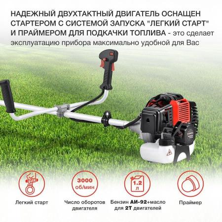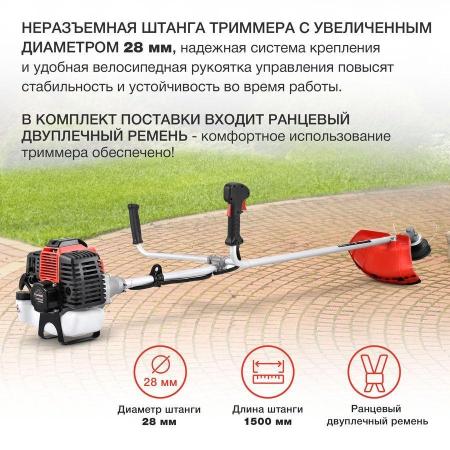Увеличенный диаметр неразъемной штанги в 28 мм обеспечивает прочность и жесткость конструкции. Эргономичная велосипедная рукоятка и ранцевый наплечный ремень, который идет в комплекте, позволяют равномерно распределить нагрузку и обеспечивают комфорт при работе с триммером.
