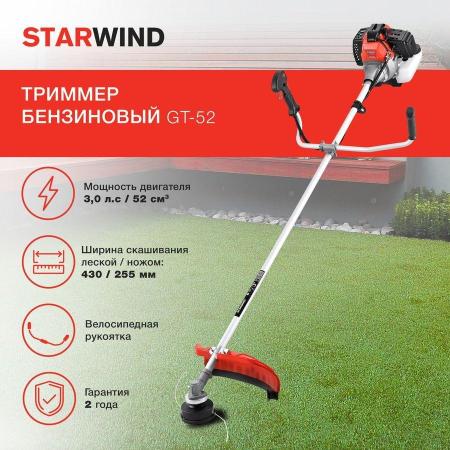 Starwind GT-52 оснащен двигателем объемом 52 см? и мощностью 3,5 л.с., достаточной для скашивания высокой и густой травы, а также кустарников и молодых побегов деревьев. Тип двигателя двухтактный. Емкость для приготовления топливной смеси идет в комплекте.