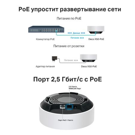 Система беспроводного доступа TP-LINK Deco X50-PoE обеспечивает надежное и высокоскоростное покрытие Wi-Fi по всему дому. Благодаря технологии Mesh создается единая бесшовная сеть без мертвых зон и разрывов соединения при перемещении.