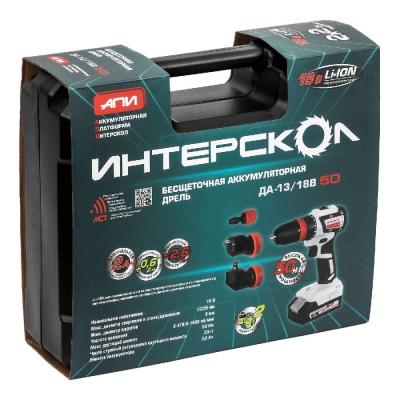 Бесщеточная аккумуляторная дрель-шуруповерт ИНТЕРСКОЛ КОМБИ ДА-13/18В 50 ( 2 АКБ 2 Ач и ЗУ, кейс )