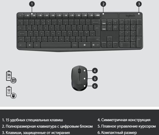 Прочие особенности и свойстваКлавиатура+мышь Logitech MK235 – комплект из двух устройств, ориентированных для использования с офисными и домашними ПК. Мембранная клавиатура с полноразмерной раскладкой и низкопрофильными клавишами обеспечивает высокую точность распознавания нажатий. Поставляемая в наборе оптическая светодиодная мышь с сенсором 1000 dpi гарантирует быстрое позиционирование курсора и плавность перемещения. Подключение Logitech MK235 выполняется посредством компактного USB-ресивера. В качестве элементов питания применяются батарейки типоразмера АА/ААА.