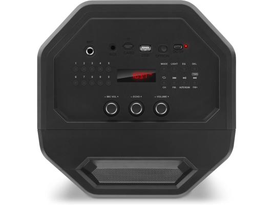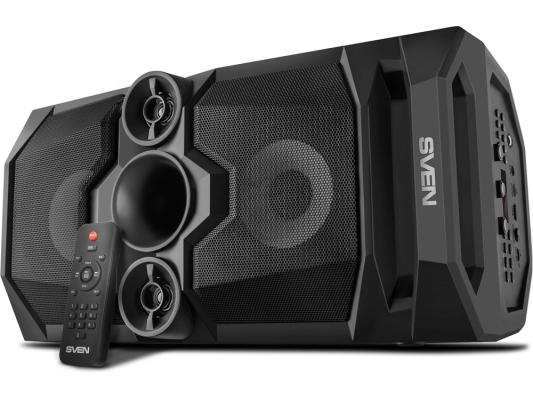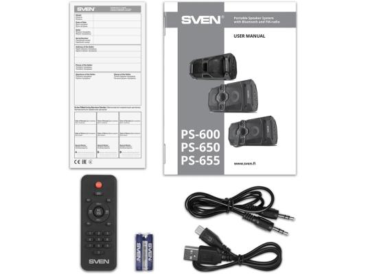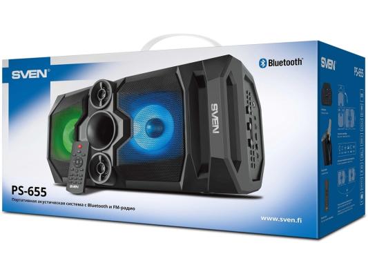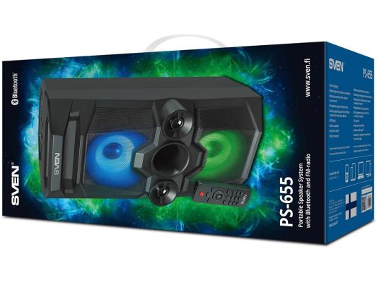 Мобильные колонки SVEN PS-655 2.0 чёрные (2x25W, mini Jack, USB Type-C, USB flash, Bluetooth, FM, micro SD, ПДУ, LED экран, 4400 мA, RGB подсветка)