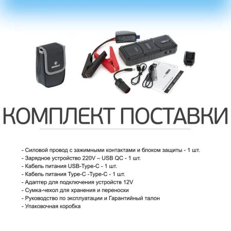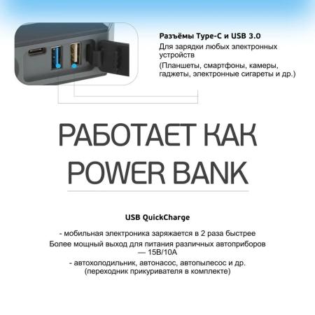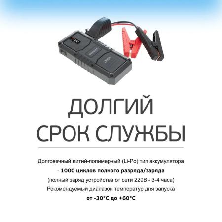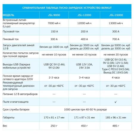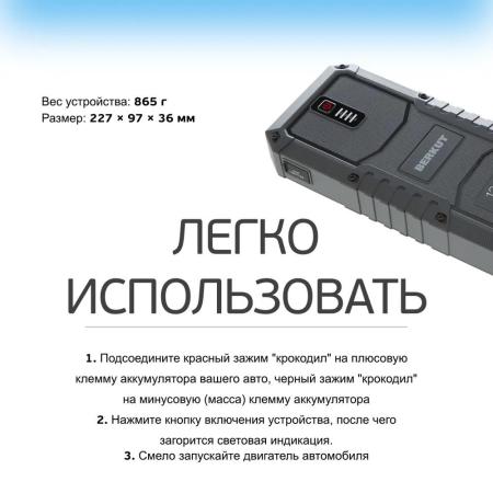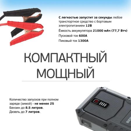 Прочие особенности и свойстваПуско-зарядное устройство BERKUT Specialist JSL-25000 позволяет запустить автомобиль с бензиновым двигателем объемом до 8.5 литров или дизельным объемом до 7 литров. Количество попыток запуска при полной зарядке – не менее 25. Модель оснащена аккумуляторной батареей емкостью 21000 мАч и несколькими выходами для подсоединения кабелей, что позволяет заряжать различные гаджеты. Устройство обладает множеством степеней защиты от перегрева, замыкания, перегрузки и других рисков в процессе эксплуатации.