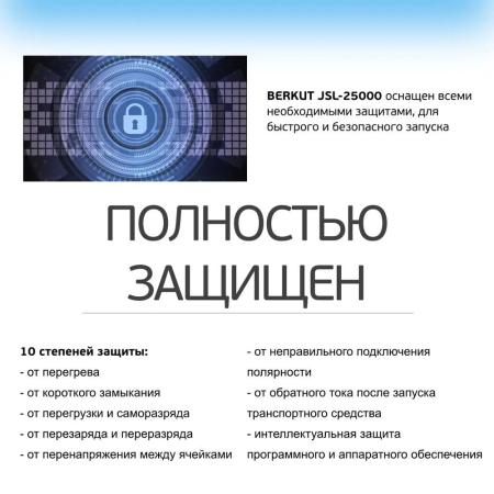 В конструкцию BERKUT Specialist JSL-25000 заложены 10 степеней защиты: от перезаряда, от переразряда, от переполюсовки, от перегрева, от короткого замыкания, от перегрузки, от перенапряжения между ячейками, от обратного тока, от саморазряда, а также интеллектуальная защита программного и аппаратного обеспечения;