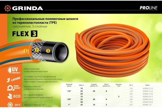 GRINDA FLEX 3, 3/4?, 25 м, 20 атм, из термоэластопласта, трёхслойный, армированный, гибкий, поливочный шланг, PROLine (429008-3/4-25)