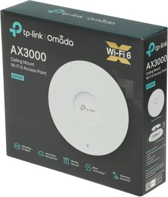 TP-Link EAP650, AX3000 Потолочная двухдиапазонная точка доступа Wi-Fi 6, 1 гигабитный порт RJ45, до 574 Мбит/с на 2,4 ГГц + до 2402 Мбит/с на 5 ГГц, PoE 802.3at и 12 v DC, 2 встр. антенны, MU-MIMO