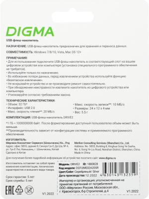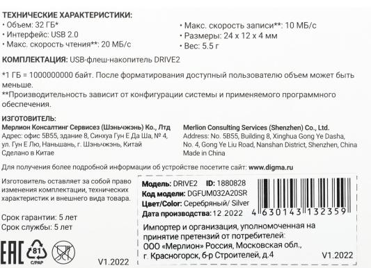 Флеш Диск Digma 32Gb DRIVE2 DGFUM032A20SR USB2.0 серебристый