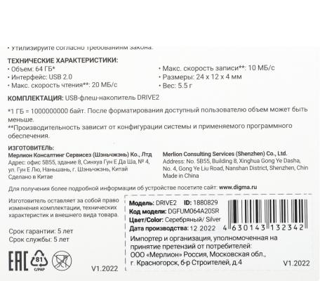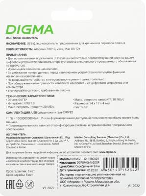 Флеш Диск Digma 64Gb DRIVE2 DGFUM064A20SR USB2.0 серебристый
