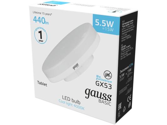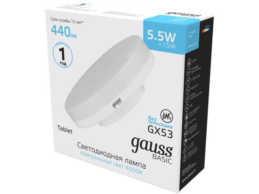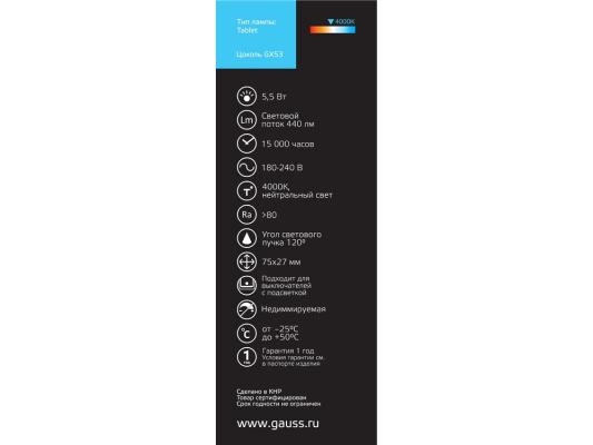 Лампа светодиодная Gauss Basic 10849262 5.5Вт цок.:GX53 таблетка 180B 4100K св.свеч.бел.нейт. (упак.:10шт)