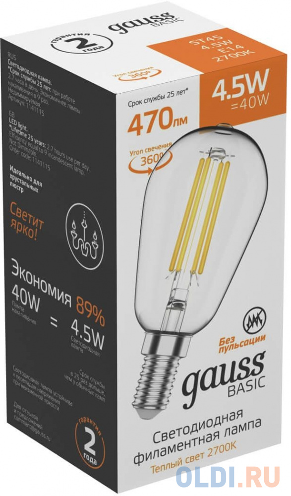 Лампа светодиодная Gauss Basic 1141115 4.5Вт цок.:E14 220B 2700K св.свеч.бел.теп. (упак.:10шт)![]()