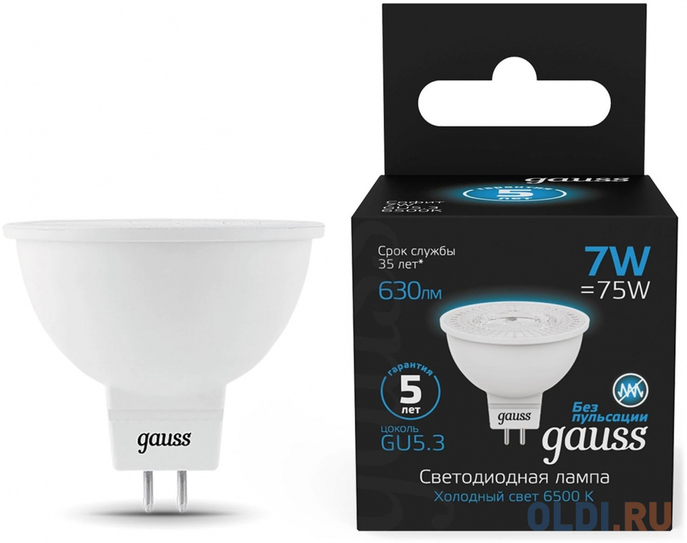 Лампа светодиодная Gauss 101505307 7Вт цок.:GU5.3 рефлек. 150B 6500K св.свеч.бел.хол. MR16 (упак.:1шт)![]()