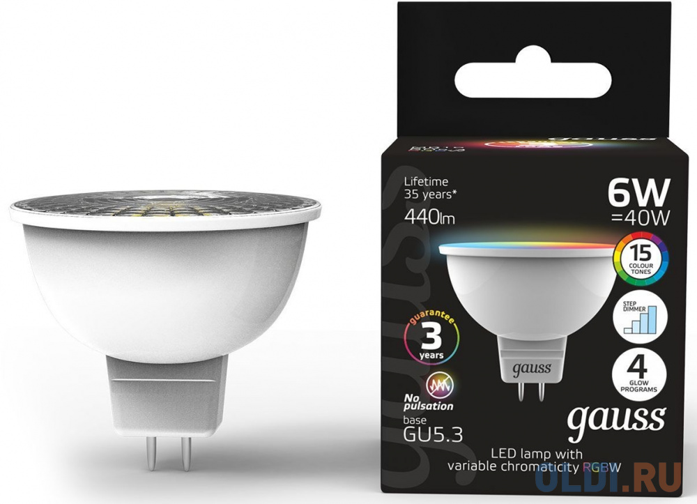 Лампа светодиодная Gauss 101105406 6Вт цок.:GU5.3 софит 175B св.свеч.RGB MR16 (упак.:1шт)![]()