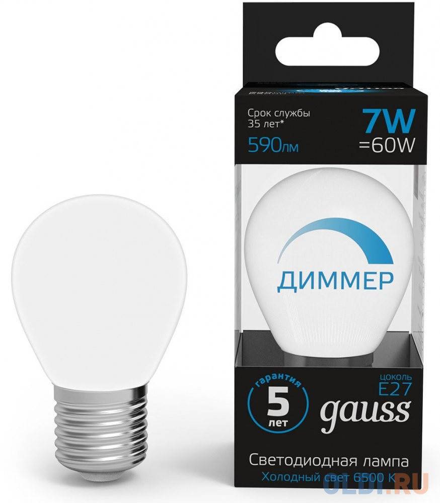 Лампа светодиодная Gauss 105102307-D 7Вт цок.:E27 шар 150B 6500K св.свеч.бел.хол. (упак.:1шт)![]()