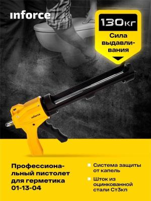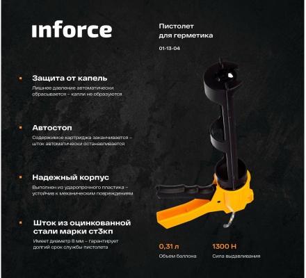 Прочие особенности и свойстваПрофессиональный пистолет для герметика Inforce 01-13-04 используется при монтажных, отделочных и ремонтных работах. С его помощью легко наносить герметизирующий состав с целью заделывания различных полостей и отверстий.