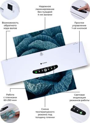 Он имеет максимальный формат А3, а также оснащен четырьмя валками, которые обеспечивают быструю работу с скоростью 30см/мин. Выбор между двумя цветами - белый и черный - позволяет легко вписаться в любой интерьер.