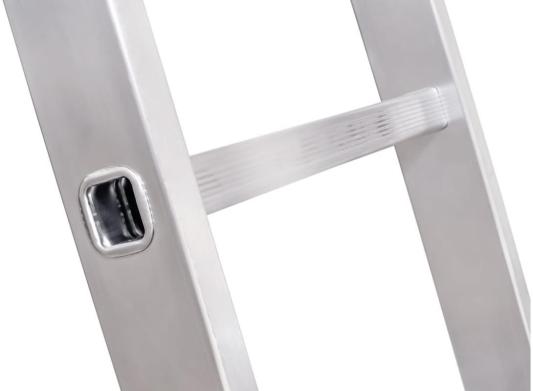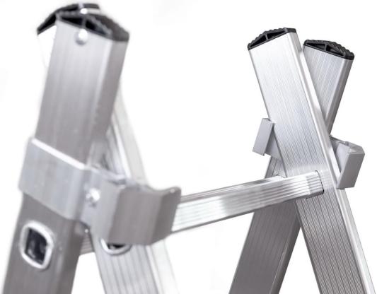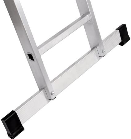 В сложенном состоянии лестница занимает мало места. Качественный профиль позволяет ей выдерживать нагрузку до 150 кг. Траверса обеспечивает устойчивость конструкции. Страховочные стяжки исключают самопроизвольное раскладывание приспособления.