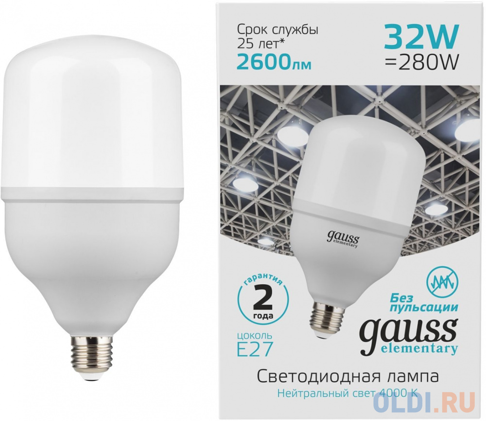Лампа светодиодная Gauss Elementary T100 32Вт цок.:E27 цилин. 220B 6500K св.свеч.бел.хол. (упак.:1шт) (63233)![]()