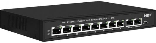 Passive PoE коммутатор Fast Ethernet на 10 портов. Порты: 8 х FE (10/100 Base-T, 52V 4,5(+) 7,8(–)) совместимы с PoE (IEEE 802.3af/at), 2 x FE (10/100 Base-T) Uplink. Совместим со стандартами PoE IEEE 802.3af/at. Мощность PoE на порт - до 30W. Поддержка режима CCTV: Увеличение расстояния передачи данных и питания до 250м. Встроенная грозозащита 3кВ. Питание: AC100-240V. Встроенный БП. Размеры (ШхВхГ): 210x35x150мм. Рабочая температура: 0...+50 гр. С)