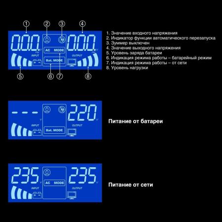 Время работы на батареях при максимальной нагрузкеОтключение через 5 мин при нагрузке > 110%