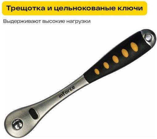 Прочие особенности и свойстваНабор инструментов Inforce 108 предметов 1/2", 1/4" 06-07-12 - многофункциональный комплект, предназначенный для работ с крепежом. Уникальная запатентованная конструкция трещотки гарантированно выдерживает высокие нагрузки. Улучшенный профиль торцевых головок успешно справляется с крепежом, грани которого деформированы на 85%. В комплекте поставляется специальная насадка, которая используется с трещоточным ключом и позволяет открутить/закрутить гайку/болт быстрее, чем обычная трещотка без этой насадки.