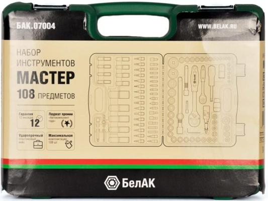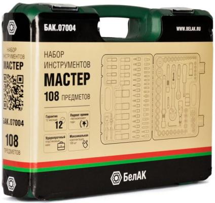 Прочие особенности и свойстваНабор инструментов БелАК МАСТЕР, 108 предметов БАК.07004 выполнен из специальной комплексно легированной стали с повышенным содержанием углерода. Прочные металлические замки и эргономичный ударопрочный кейс делают набор головок с трещоткой эффективным и мобильным.