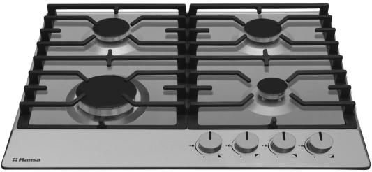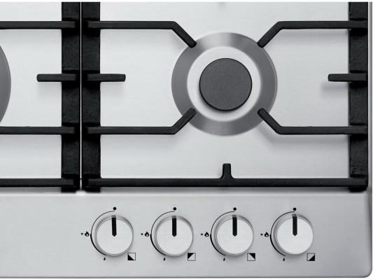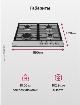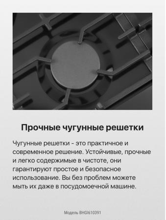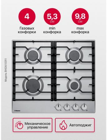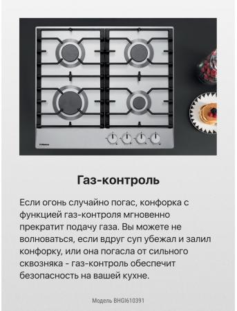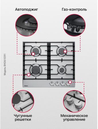 Встраиваемая варочная панель/ Варочная поверхность, газовая BHGI610391, 4 газовых конфороки (1х5,3см,2х7,3cм, 1х9,8см), ЧУГУННЫЕ РЕШЕТКИ, автоподжиг, газ-контроль, нержавеющая сталь