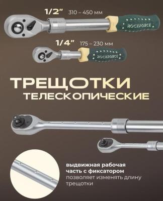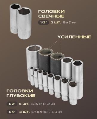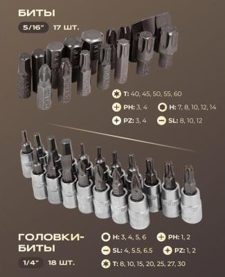 * 108 предметов: головки 1/4"короткие, глубокие, Е-профиль короткие, головки-биты HEX, TORX, SL, РН, PZ; трещотка телескопическая; удлинители; кардан шарнирный;