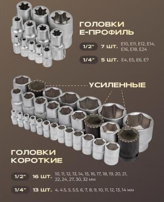 Набор включает в себя множество функциональных элементов: от стандартных ключей и битов до специальных головок для Е-профилей. Рукояти и трещотки сделаны из прочного металла, что обеспечивает надежное держание и удобство использования.