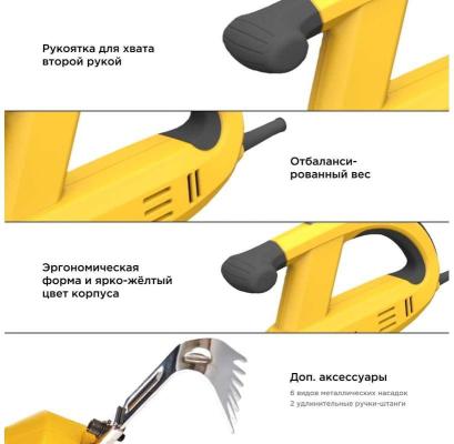 Это корнеудалитель, удалитель сорняков, пропалыватель, рыхлитель, электротяпка в одном небольшом корпусе ярко-желтого цвета.