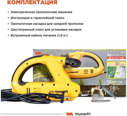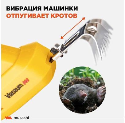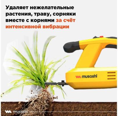 ОписаниеЭлектрическая прополочная машинка Musashi WE-700 удаляет нежелательные растения, сорняки, сорную траву, удаляя-вытаскивая-вытягивая их корневую систему из земли благодаря работе в паре с насадкой, которая с помощью турбомоторчика двигается интенсивным вибродвижением вперед-назад с амплитудой хода 10 мм со скоростью 2500 раз в минуту.