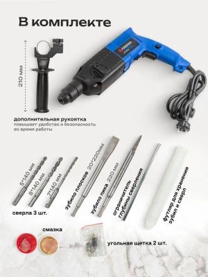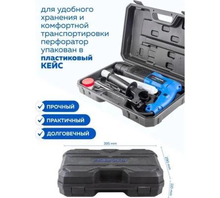 Широкая комплектация позволяет использовать электроперфоратор сразу, нет необходимости искать расходные материалы. Реверс служит для легкого выкручивания сверла из материала. Перфоратор имеет резиновый кабель питания, который стоек к механической нагрузке (ударам, перегибам, порезам).