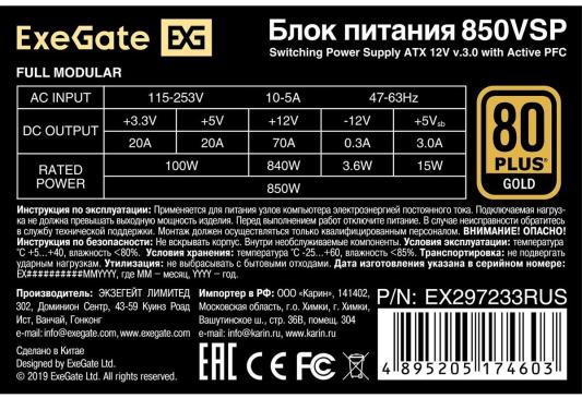 Блок питания 850W ExeGate 80 PLUS® GOLD 850VSP FС (ATX3.0, APFC, КПД 90% (80 PLUS GOLD), 120mm fan, 24pin, 2x(4+4)pin, PCIE5.0/12VHPWR, 4xPCI-E, 6xSATA, 3xIDE, 1xFDD, Full Cable Management, black, Color box)