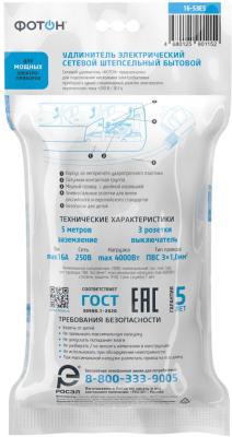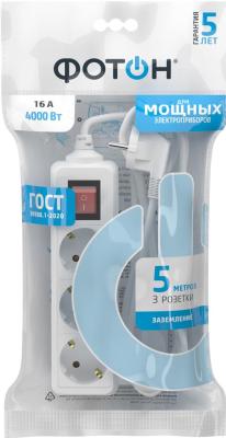 ФОТОН Удлинитель сетевой " 16-53ЕS, 5м, 3 розетки, 16А, с выключателем, с заземлением, Белый 24753