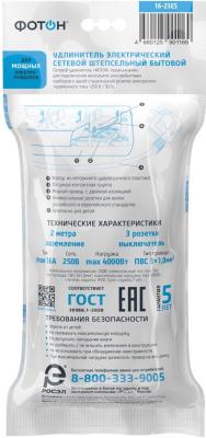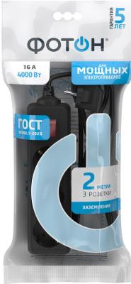 ФОТОН Удлинитель сетевой 16-23ЕS, 2м, 3 розетки, 16А, с выключателем, с заземлением, Черный 24754