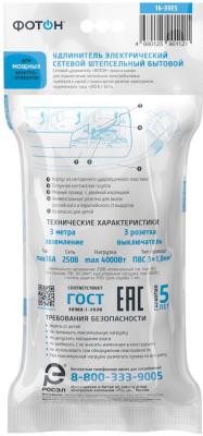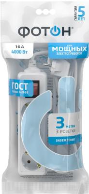 ФОТОН Удлинитель сетевой " 16-33ЕS, 3м, 3 розетки, 16А, с выключателем, с заземлением, Белый 24752