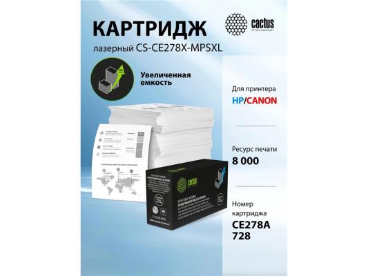 Картридж лазерный Cactus CS-CE278X-MPSXL CE278A/Canon 726/728 черный (8000стр.) для HP J M1536 MFP/M1536DNF/P1560/P1566/P1606/P1606DN; Canon LBP6200D/6200dw/6230d/6230dw/FAXPHOHE L100/L190, i-SENSYS MF4570/DN/4550/D/4452/4450/4410/4420/N/4412/DN/4580/DN/4430/4770n/4880dw/4890dw/D520/D530/D550 Canon