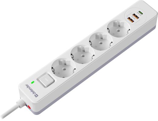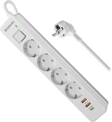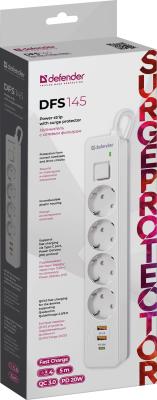 Defender Удлинитель с сетевым фильтром DFS 145, белый, 4розетки, USB+TypeC, 5 м.