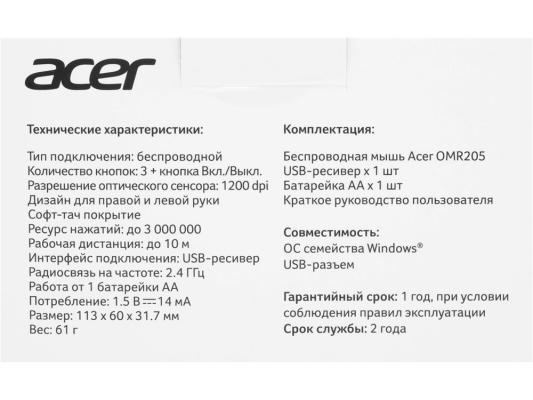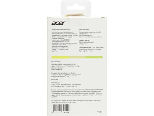 Мышь беспроводная Acer OMR205 green (1200dpi, USB,(2but) (ZL.MCEEE.02J)