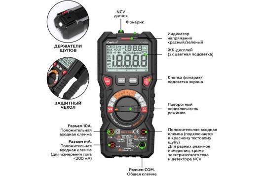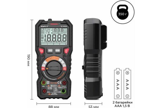 ОписаниеiCartool IC-M120 - профессиональный цифровой мультиметр с высокой точностью и надежностью измерений. Имеет разрядность 20 000 отсчетов и высокий рейтинг электробезопасности CAT III 1000V, CAT IV 600V. Работает в режиме TrueRMS. Обладает широким функционалом.