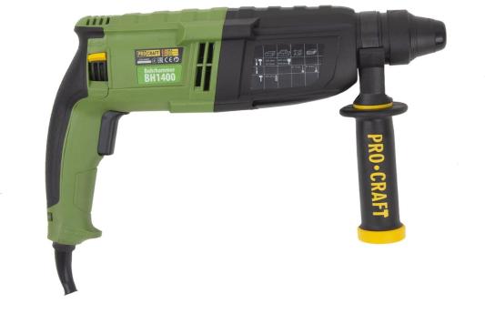 Прочие особенности и свойстваПерфоратор Procraft BH-1400 с патроном SDS+. Инструмент подходит для долбления в бетоне, сверления стали и дерева. Данная модель имеет встроенную систему демпфирования на рукоятках, что уменьшает вибрацию во время работы и снижает нагрузку на суставы. Пользователю предлагается четыре режима работы. Комплектация: кейс, рукоять, ограничитель глубины сверления, глубинометр, бур 3 шт.