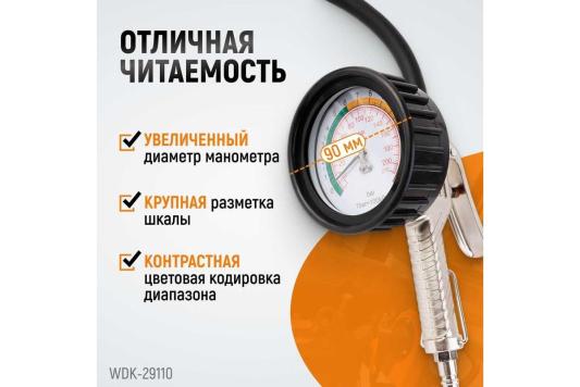 В отличие от большинства аналогов, WDK-29110 предлагает не только стандартные функции, но и дополнительные удобства для профессионального использования. Увеличенная длина шланга, универсальность, высокое качество материалов и точность измерений делают этот пистолет для шин лучшим выбором для тех, кто ценит надежность и эффективность в работе.