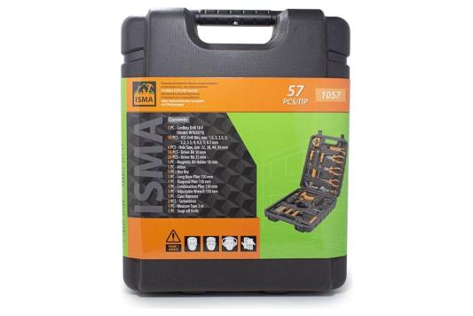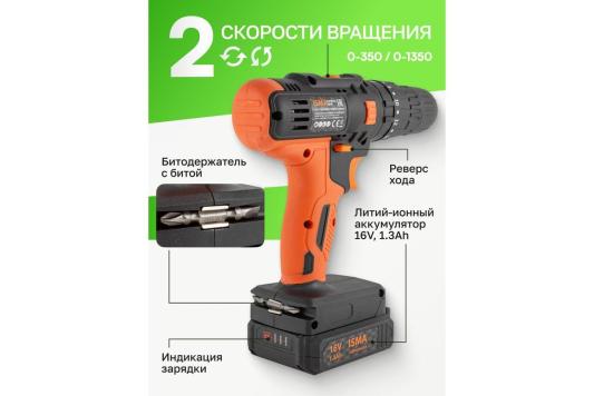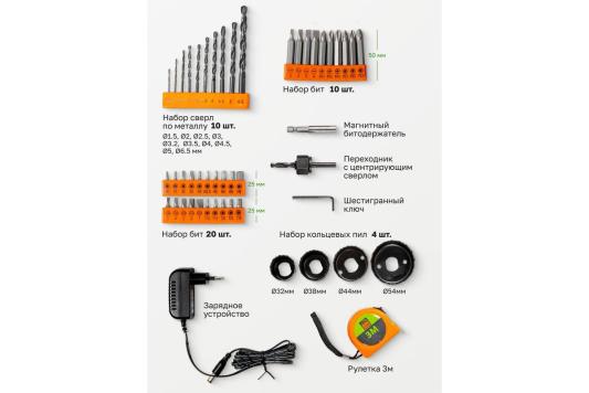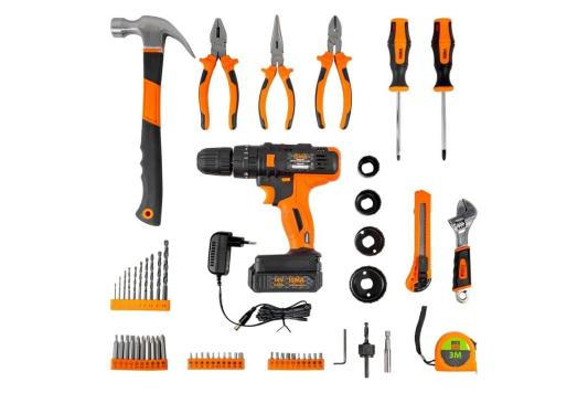 Прочие особенности и свойстваНадежная и производительная аккумуляторная дрель шуруповерт с набором сверл и кольцевых пил станет отличным подарком домашнему мастеру, дачнику и владельцу загородного коттеджа. Набор инструментов из 57 предметов в кейсе комплектуется самим шуруповертом на 16 Вольт, несколькими отвертками, молотком, плоскогубцами, кольцевыми пилами, сверлами и остальными нужными инструментами для монтажа. Для удобства хранения и использования набор инструментов отпускается в красивом эргономичном кейсе из пластика. Рекомендуемая первая зарядка аккумулятора для дрели-шуруповерта 24 часа.