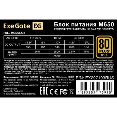 Блок питания 650W ExeGate M650 GOLD (SFX, APFC, КПД 90% (80 PLUS GOLD), 9cm fan, 24pin, (4+4)pin, 2xPCI-E, 6xSATA, 3xIDE, 1xFDD, Full Cable Management, black, ATX adapter, Retail box)