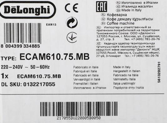 Кофемашина Delonghi ECAM610.75.MB 1450Вт черный/серебристый