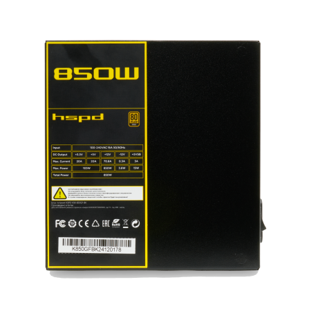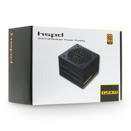 Блок питания/ Power Supply HSPD, 850W 80+ Gold (ATX, 2.52, Full modular, 1x24(20+4)pin mesh 550mm, 1xCPU*2 8(4+4)pin 650+150mm, 2xPCIe*2 8(6+2)pin 500+150mm, 2xSATA*3 450+150+150mm, 1xMOLEX4pin*3 450+150+150mm , Active, 120x120mm, 150x140x86mm, APFC, OVP, UVP, SCP, OCP, OTP, OPP, NLO, SIP, black)