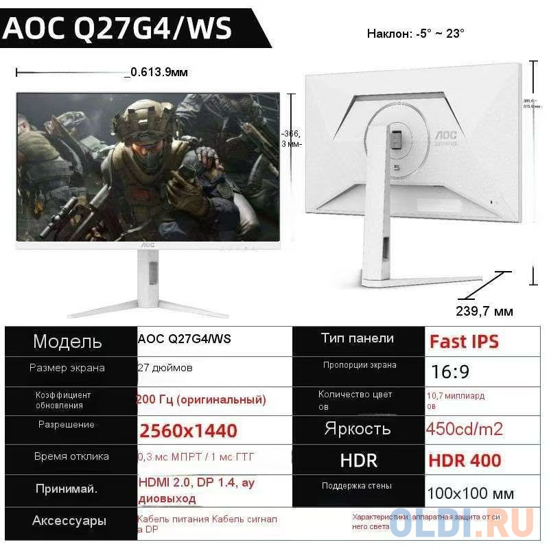 Монитор 27 дюймов АОС Q27G4/WS белый с поворотом экрана - идеальное решение для геймеров и профессионалов.