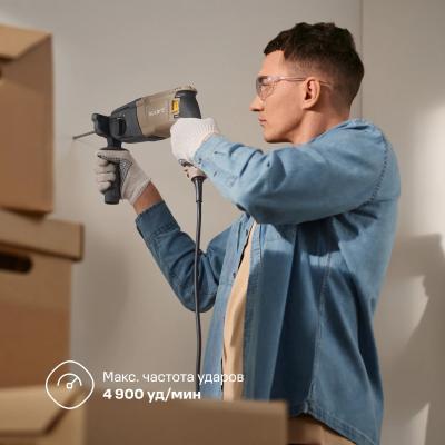 Максимальная мощность перфоратора составляет 800 Вт, что позволяет выполнить тяжелые работы в короткие сроки. Количество ударов за минуту достигает 4900 уд/мин, а максимальная энергия удара составляет 3 Дж, что гарантирует эффективное сверление и долбление.